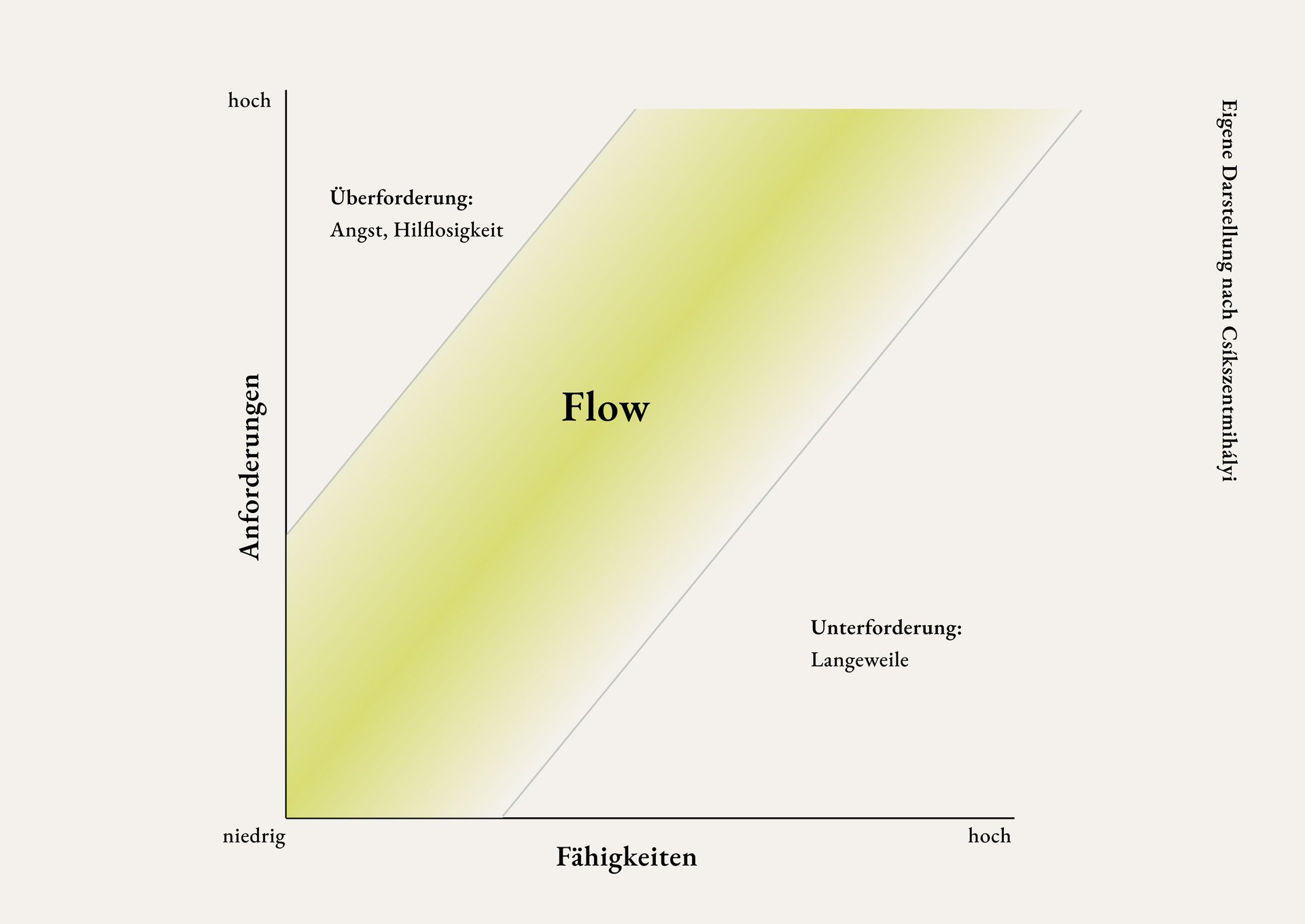 Flow entsteht vor allem dann, wenn Anforderung und Fähigkeit miteinander im Einklang stehen. Liegt eine Aufgabe genau zwischen Unter- und Überforderung – ist sie also herausfordernd, aber gut zu bewältigen –, kann Flow eintreten (siehe Abbildung).